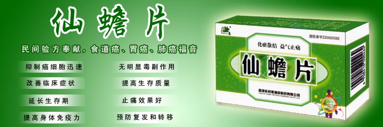 仙蟾片对肺癌、胃癌、肝癌、乳腺癌、食道癌、淋巴癌、肠癌、鼻咽癌、卵巢癌、骨癌、脑瘤、白血病等各种癌症均有良好的治疗效果。仙蟾片它的主要成份有人参、仙鹤草、蟾酥、郁金、黄芪、当归、半夏、补骨脂、马钱子等纯中药材料,以民间验方为基础,同时在临床中不断研究总结,运用现代科学手段研制开发的抗癌复方纯中药。